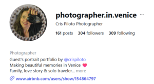 - Airbnb Experience. Fotografa freelance (2019–2024) Roma e Venezia.